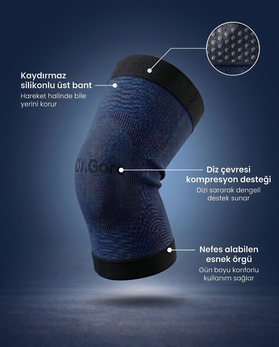 Dr.Gore Dizliklerinin kaydırmaz silikonlu yapısı, ince ve nefes alan kumaşı sayesinde terletme ve kaşıntı yapmaz. Uzun süreli kullanımda bile daima desteğini sunar.